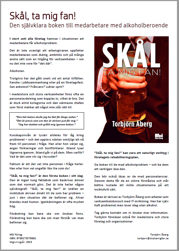 ”Skål, ta mig fan!” är skriven just för personer med alkoholproblem. Inget moraliserande. Inget fördömande. ”Skål, ta mig fan!” är ingen faktabok utan är mer en självinsiktsbok med konkreta förslag vad man kan göra åt sin situation. Igenkänningen har visat sig vara mycket hög. Den har hjälpt många.